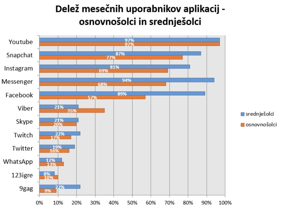 Po izsledkih raziskave, ki je bila izvedena v okviru projekta Odklikni!, pri katerem sodelujejo MDDSZ, Fakulteta za družbene vede Univerze v Ljubljani, MNZ - Policija in MP - Center za izobraževanje v pravosodju, je med vsem aplikacijami, ki jih mladi najraje uporabljajo YouTube, sledijo ji Snapchat, Instagram, Messenger in Facebook.
