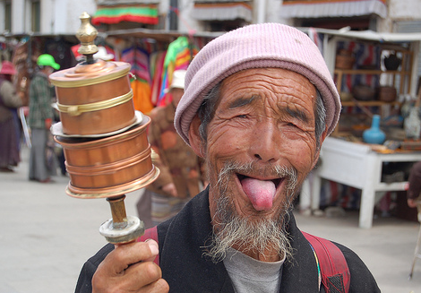 Tibetanci pa ob pozdravu pokažejo jezik. Za ta običaj je »kriv« zloben kralj Lang Darma iz 9. stoletja, ki naj bi imel črn jezik. Zato so ljudje ob srečanju začeli en drugemu kazati jezik, da bi tako dokazali, da niso njegova reinkarnacija.