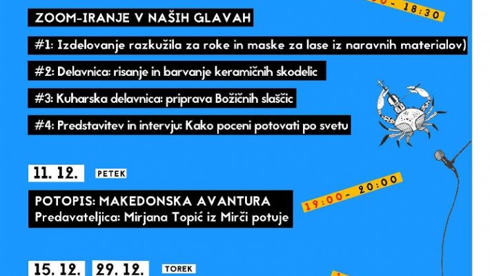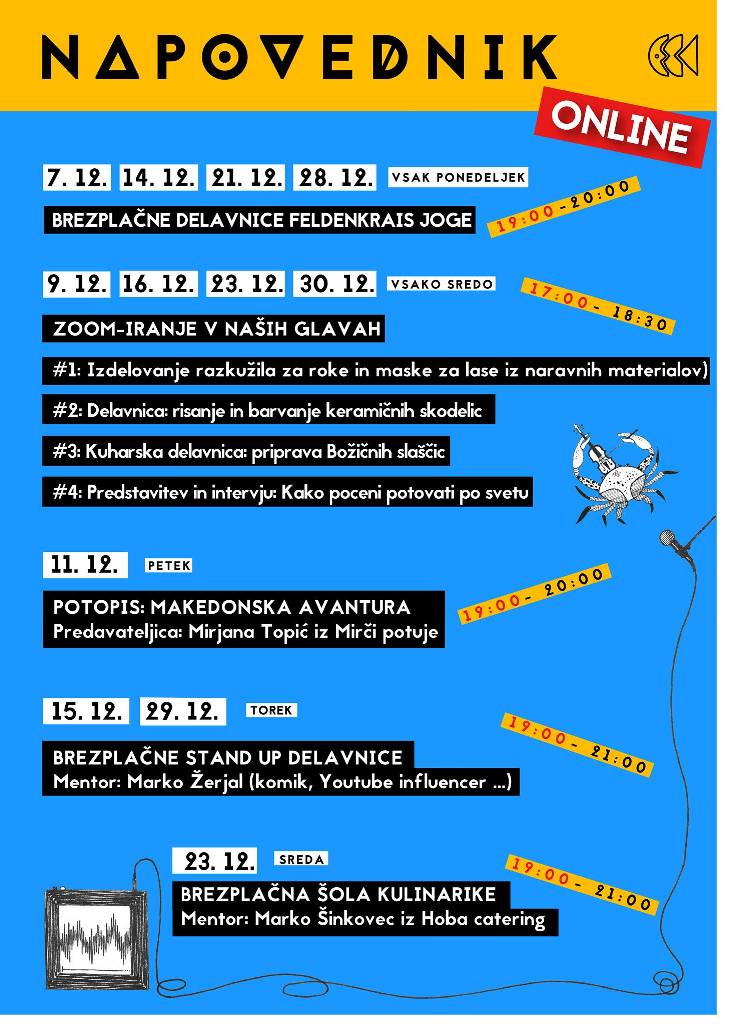 CMK-jeva Facebook stran in platforma zoom bosta ob ponedeljkih ponujala delavnice Feldenkrais joge, ob sredah izelavo razkužil, prazničnih slaščic, risanje po skodelicah ter potopisno predavanje. 15. 12. in 29. 12. 2020 bo potekala tudi delavnica stand-up komedije, ki jo bo vodil komik in Youtube influencer, Marko Žerjal.