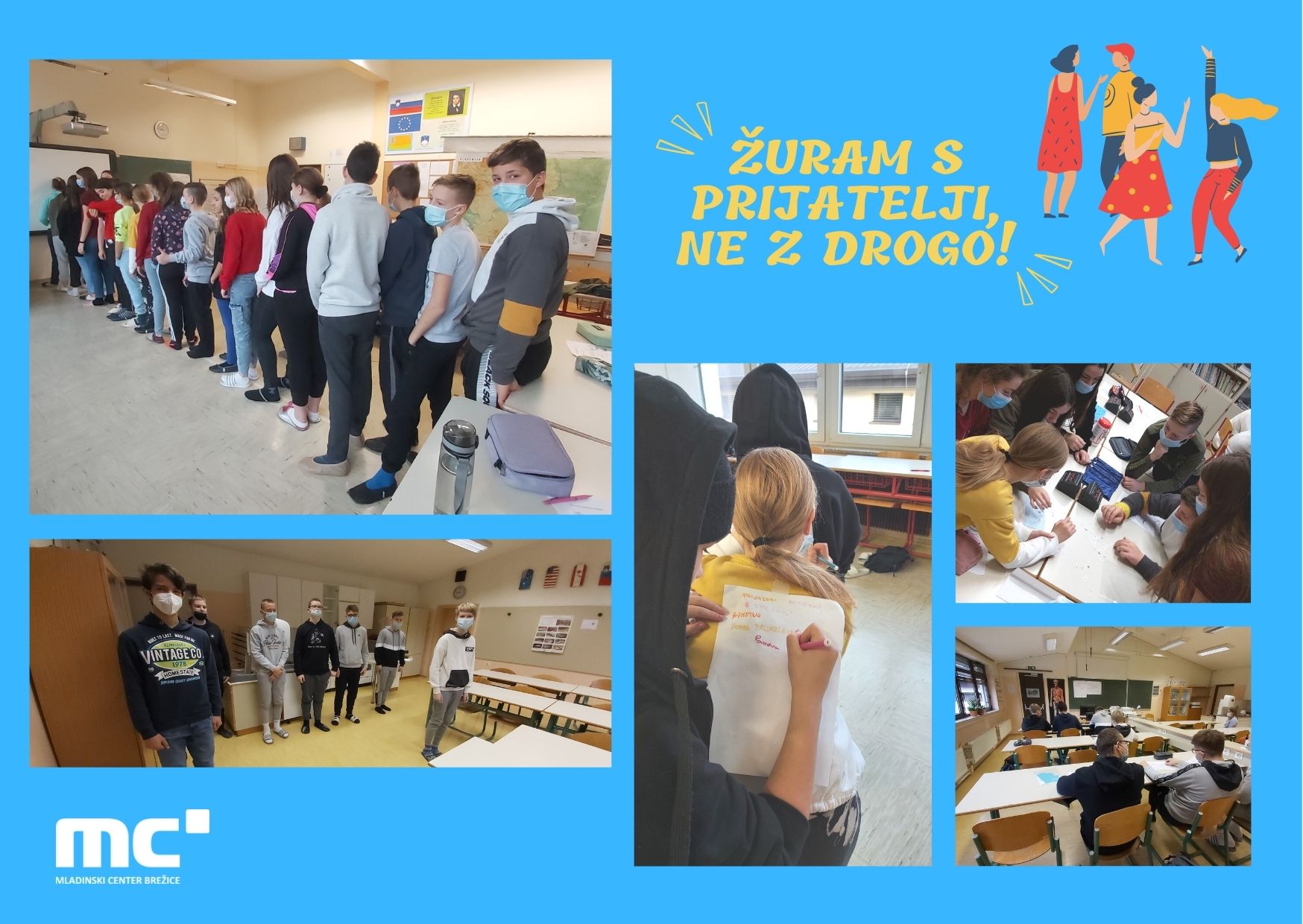 V Zavodu za podjetništvo, turizem in mladino Brežice so izvedli že 3 izvedene preventivne delavnice in predavanja programa "Žuram s prijatelji, ne z drogo!": 17. 12. 2022 za OŠ Bizeljsko, 22. 12. 2022 za OŠ Velika Dolina in 23. 12. 2022 za OŠ Globoko. V novem letu bodo nadaljevali program in tako izvajali delavnice 1. 2. 2022 na OŠ Artiče, 13. 5. 2022 na OŠ Cerklje ob Krki, 6. 5. 2022 na OŠ Brežice in 10. 6. 2022 na OŠ dr. Jožeta Toporišiča Dobova. Z devetošolci se na delavnicah in predavanjih pogovarjajo o različnih vrstah zasvojenosti in kako se lahko obvarujemo pred drogami ter poudarijo pomen pozitivne samopodobe.